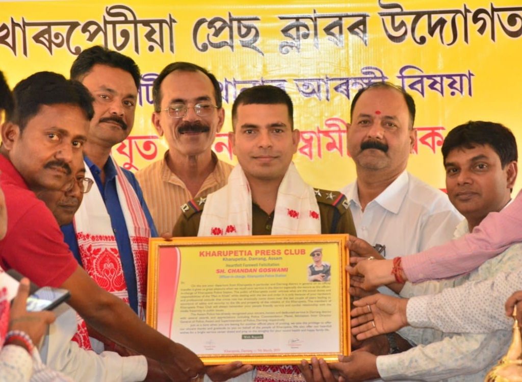Mangaldai : ‘You were the ‘Singham’ for the youths of Kharupetia. You created terror among those youths who used to loiter in the streets after evening hours or make the habit of violation of traffic rules . But they all will turn obedient immediately they receive any signal of your possible arrival- be careful Signham is coming. It is your uncompromising nature against any form of crime that helped us pass peaceful nights in your tenure ”, said Abdul Ali , a teacher of Kharupetia . He speaking on the occasion of public farewell function of outgoing Officer in Charge of Kharupetia Police Station Sub Inspector Chandan Goswami organized by Kharupetia Press Club on Saturday. Similar kind of voice also echoed in speeches of several other speakers of the function including Chairman of Kharupetia Municipality Board