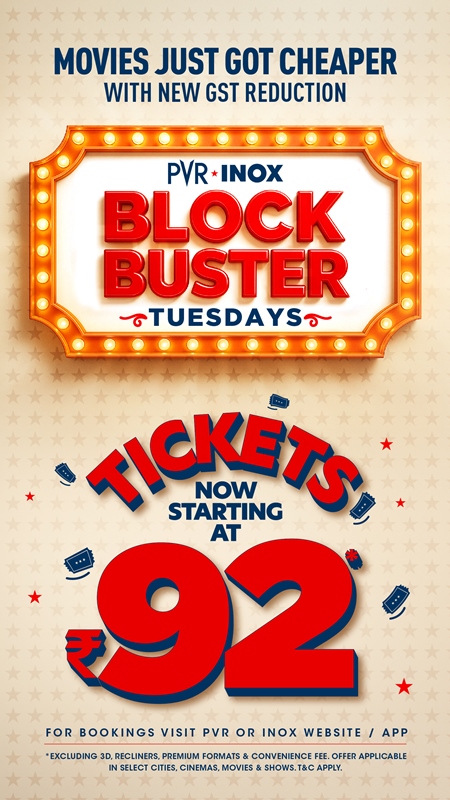 PVR INOX, India’s largest and most premium cinema chain, today announced a revision in ticket pricing for its popular Blockbuster Tuesdays offer. Starting Tuesday, 23rd September 2025, the base price for Blockbuster Tuesday tickets will be ₹92 (₹95 inclusive of GST) reduced from ₹99. This adjustment ensures that the benefits of the recent GST reduction are directly passed on to audiences, making cinema more affordable for all.