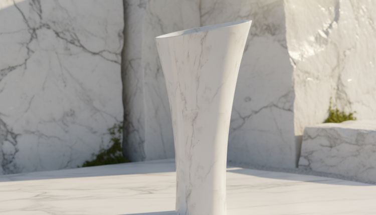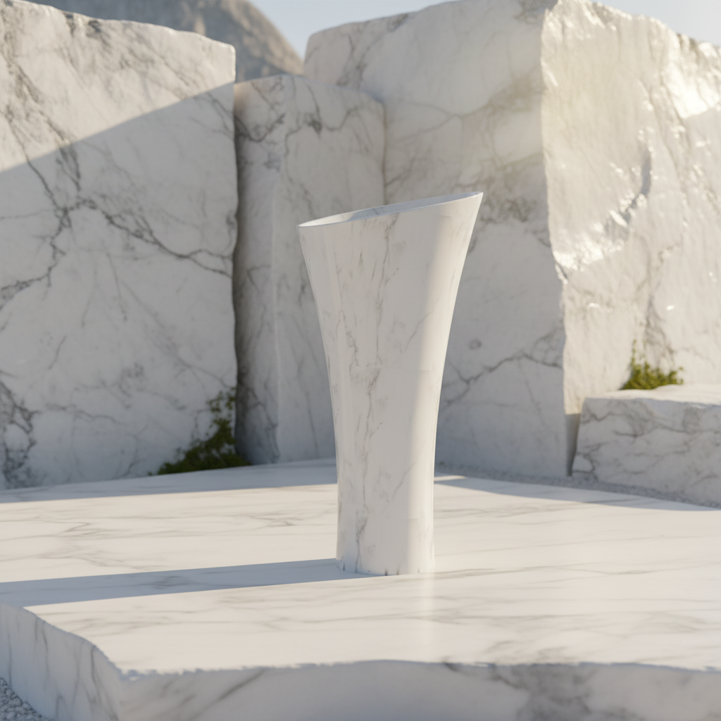 ● The Adri freestanding basin in Banswara White Gloss: The Adri freestanding basin is designed to anchor the space. Its tall, monolithic form makes an immediate statement, while the stone itself, sourced from Banswara in Rajasthan, carries a natural luminosity that few materials can match. A bright white surface with subtle purple and grey tonal markings delivers a clean yet luxurious aesthetic. The naturally high-gloss finish deepens visual impact, while low water absorption resists staining and discolouration over time. Sustainably sourced from one of India’s finest natural stone regions, the Adri brings both beauty and environmental consideration to the premium bathroom.