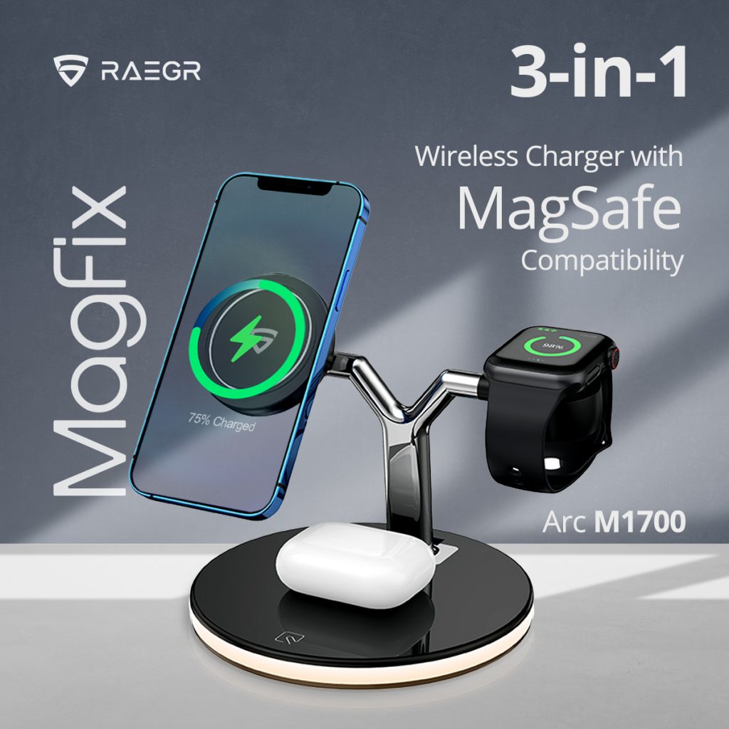 Bengaluru: Homegrown consumer lifestyle technology brand RAEGR officially announces MagFix Trio Arc M1700 in India. This elegant-looking and must-have accessory is a single-point 3-in-1 Magnetic wireless charging stand that can simultaneously recharge an Apple iPhone, Apple Watch and Apple AirPods. The Arc M1700 also features a bed lamp and is a superb investment for your bedroom or as a gifting option for all those who own the new Apple devices.