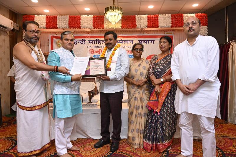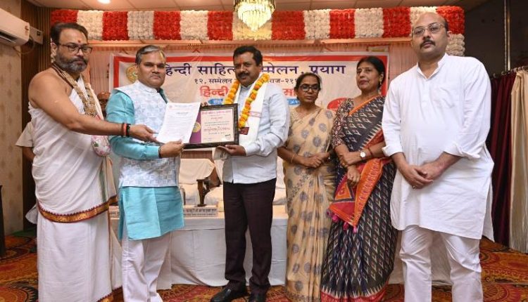 New Delhi: Renowned literary figure Rajiv Acharya was conferred with the esteemed honorary title of Sahityamahopadhyay at a grand ceremony organized by the Hindi Sahitya Sammelan, Prayagraj.