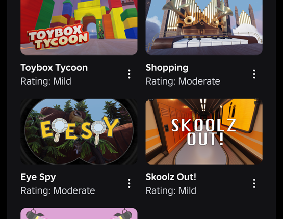 3.           Content Maturity Rating and Default Exclusions: Roblox will assign an appropriate content maturity label (Minimal, Mild, or Moderate) for each game. By default, Roblox Kids and Roblox Select accounts will not include games that feature sensitive issues, social hangouts, or free-form drawing games.
