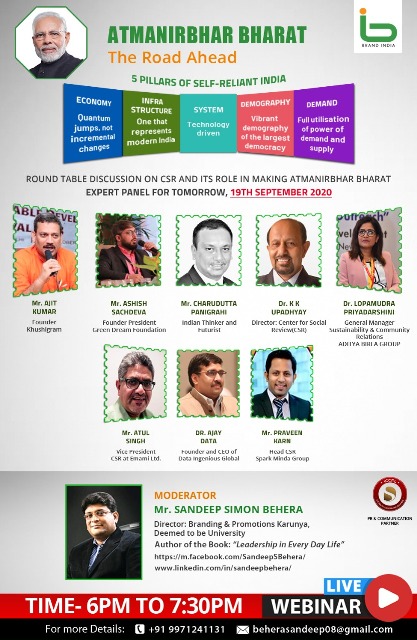Brand India organized a round table discussion on Atmanirbhar Bharat and the role of CSR in making New India. The event focused on discussing five pillars of self-reliant India including Economy (quantum jumps, not incremental changes), Infrastructure (that represents modern India), System (technology driven), Demography (vibrant demography of the largest democracy) and Demand (full utilization of power of demand and supply).