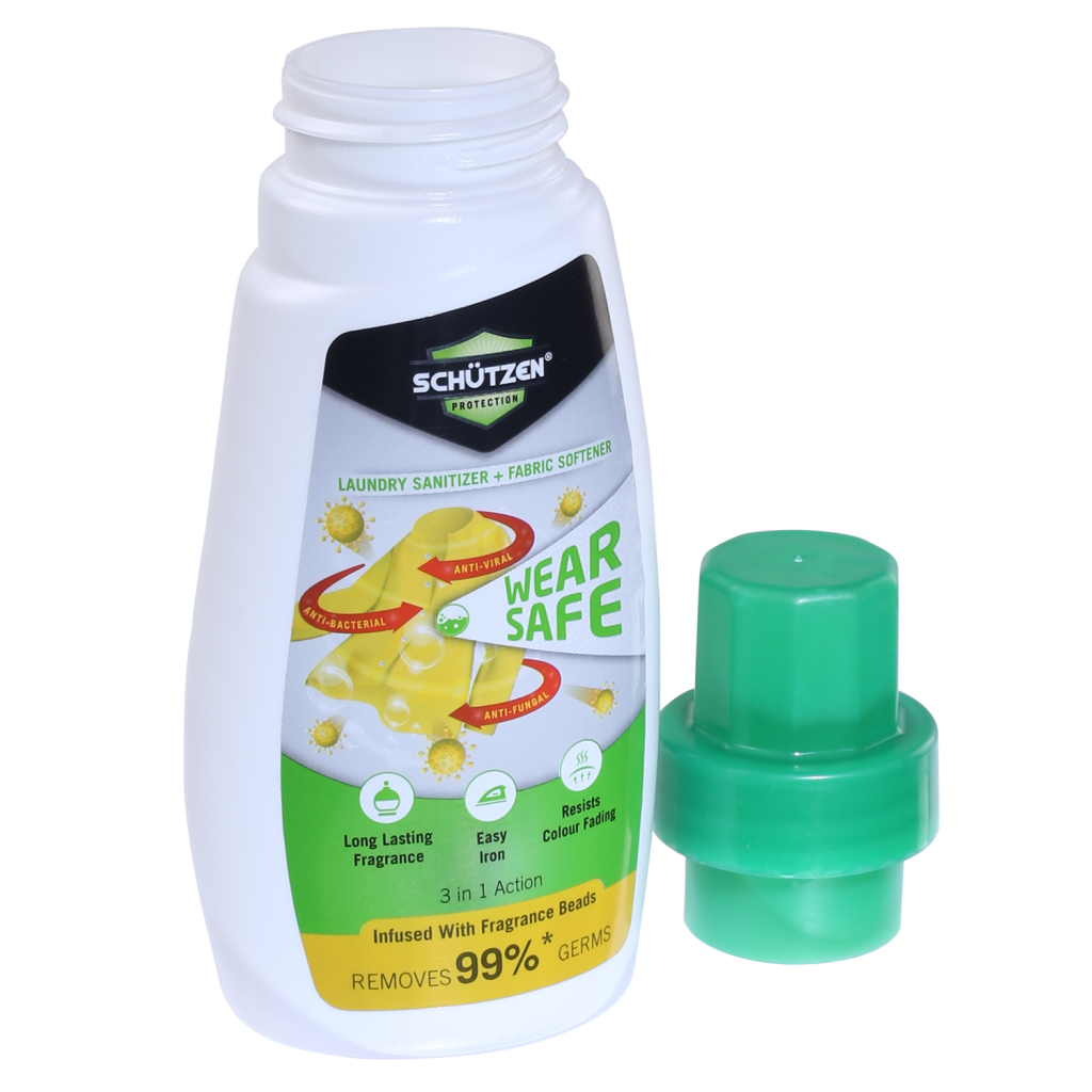SCHUTZEN WEAR SAFE Fabric Softener and Laundry Sanitiser’s unique formulation is based on 4th generation softener& New Generation sanitising &hygienetechnology.It removes 99%* of Germs including Bacteria, Virus & Fungus in both hot and cold water such as Staphylococcus aureus ATCC 6538,which may manifest to cause minor skin infections to more serious brain or heart infections Klebsiella Pneumoniae ATCC 4352 which are associated with infections such as urinary tract infections, pneumonia etc.