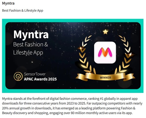 “Myntra stands at the forefront of digital fashion commerce, ranking #1 globally in apparel app downloads for three consecutive years (2023-2025), according to Sensor Tower research data. Far outpacing competitors with nearly 20% annual growth in downloads, it has emerged as a leading platform powering Fashion & Beauty discovery and shopping, engaging over 80 million monthly active users via its app.” according to Sensor Tower
