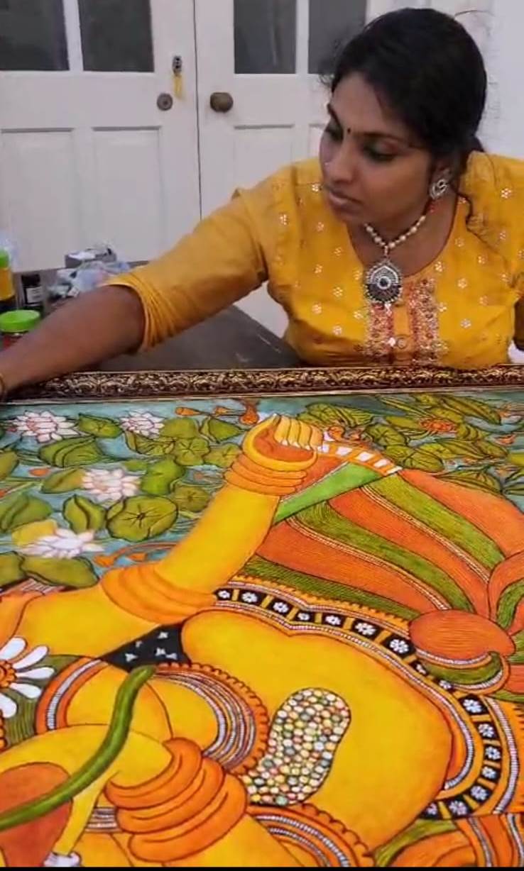Her path has not been without challenges. The sudden loss of her father brought uncertainty to her family. It was during this time that her uncle introduced her to the vibrant artistic community on Jew Street in Mattancherry, Kochi. Guided by early mentors such as Sara Hussain and Onyx Paulose, she began accepting professional commissions — painting shops, homes, fabrics, and garments — gradually building her confidence as an independent artist.
