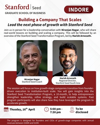 Indore : The Stanford Graduate School of Business, through its Stanford Seed initiative, will host a high-impact leadership session titled “Building a Company That Scales” in Indore on April 16 from 5:00 pm to 7:30 pm. The session is designed to support founders and CEOs of growth-stage companies as they transition from founder-led operations to institutionally scalable enterprises.