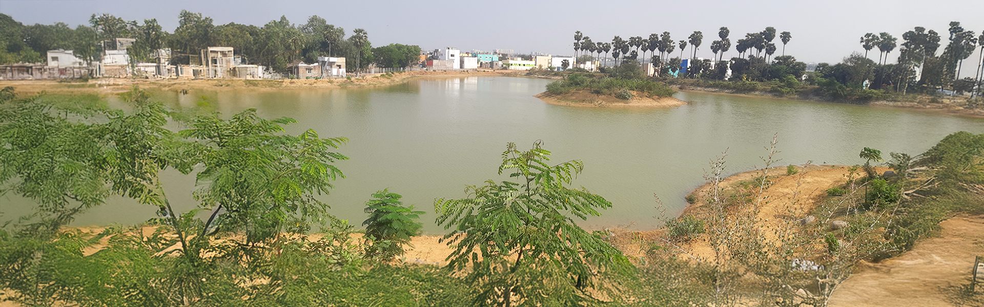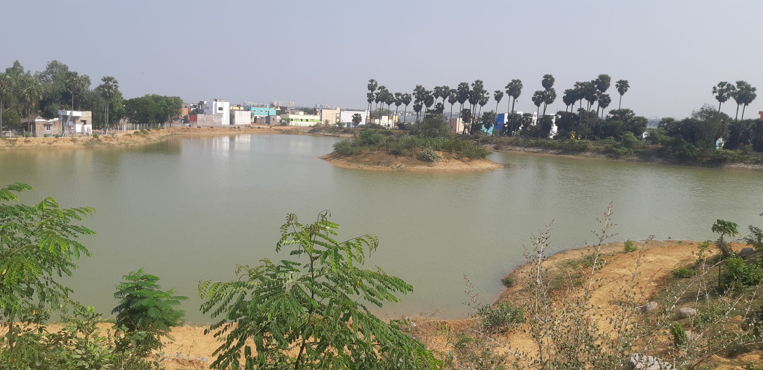 A well-planned land shaping strategy was designed for the 15.01-acre lake, incorporating features such as platforms, an island, and two small hills with walking tracks. The land shaping phase involved careful excavation and the desilting 4 acres of the lake to a depth of 1.5 m. The excavated silt and soil were then utilised to create hills, islands, and bunds, contributing to the revitalisation of the lake’s ecosystem. Over 4,000 plants of native species were thoughtfully planted on the bunds, platforms, island, and hills within the desilted lake area.