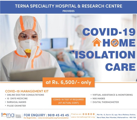 Mumbai: As Maharashtra state is struggling to fight covid-19, thanks to dearth of hospital beds, the state health department has issued guidelines allowing individuals testing positive for corona but with mild or no symptoms to be isolated at home if appropriate facilities are available at their home. Home care is becoming the next front in the battle against the coronavirus as private hospitals look to ease the burden on overwhelmed healthcare systems. Terna Speciality Hospital & Research Centre in Navi Mumbai is the first hospital who started COVID Home Isolation Care services with minimum charges for patients with mild symptoms of Coronavirus. A 14 day remote monitoring package (Rs.6500/-) home isolation care service which include Online Doctor Consultation every third day, daily Virtual Assistance & Monitoring, daily monitoring of a patient’s vital signs with a trained paramedical staff on call every day, 10 days Medicine, N95 Masks, Surgical Masks,Digital Thermometer, Pulse Oximeter. At the same time, hospitals will facilitate it if hospitalization is required.