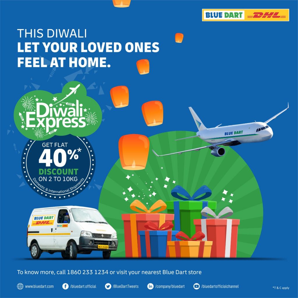 Speaking about the Diwali Express, Mr. Ketan Kulkarni, CMO & Head – Business Development, Blue Dart said, “The festive season is an important time of the year as in these next few months, we see business pick up across industry verticals but most importantly it is a time where our customers feel the joy and spread the happiness. This year follows suit, and I would encourage consumers to avail this special offer across all Blue Dart stores. We want to give families that live apart, the opportunity of experiencing the festive season to the fullest by staying connected across the country and globe. We strive to provide a hassle-free, accurate and timely delivery so that people can enjoy their Diwali to the utmost.”