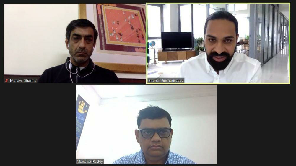 Mahavir Sharma,, TiE Global Chair; Sridhar Pinnapureddy, TiE Global Summit 2020 Chair, President, TiE, Hyderabad and Manohar Reddy., TiE Global Summit 2020 Vice Chair, Vice President, TiE, Hyderabad while addressing a virtual press conference here in Hyderabad today.