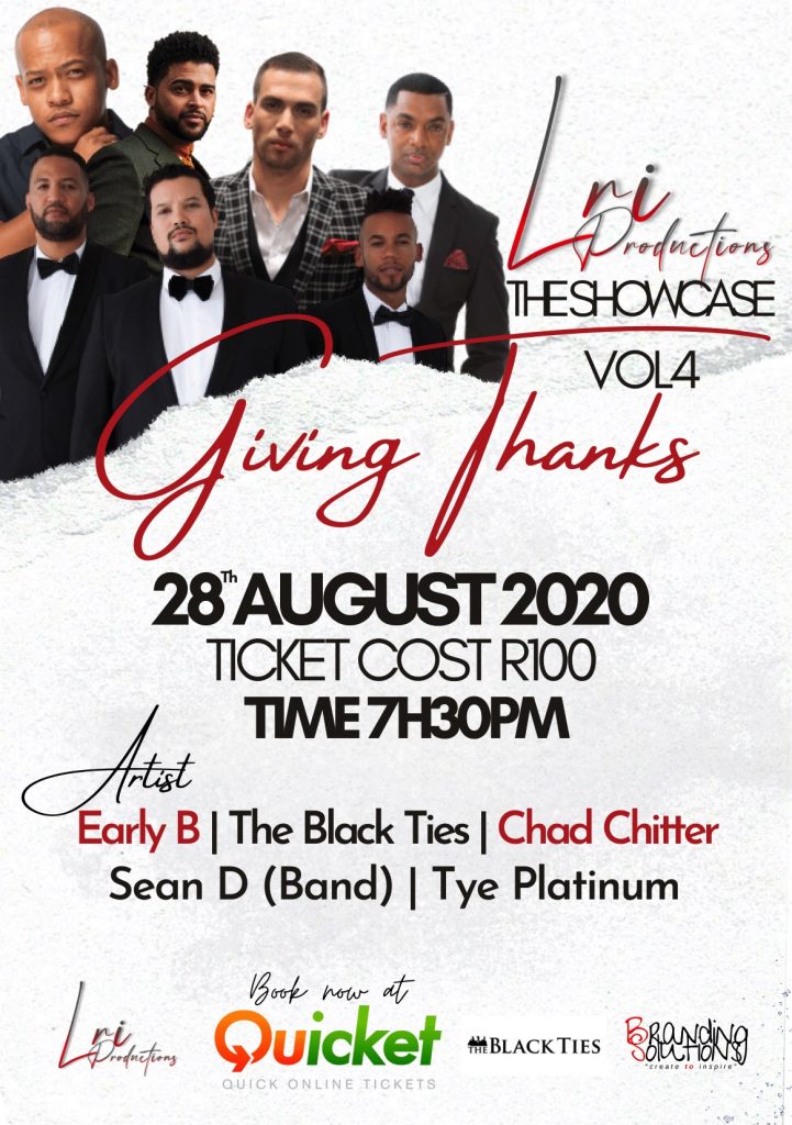 Hosted by LRI Productions, musicians such as The Black Ties (Keeno-Lee Hector, Chad Saaiman and Lloyd Jansen), rapper Early B, Chad Chitter (MC and DJ), Sean De Vries (backing band) as well as the soulful crooner Tye Platinum, will all perform in a once off Women’s Month virtual concert celebration on Friday 28 August.