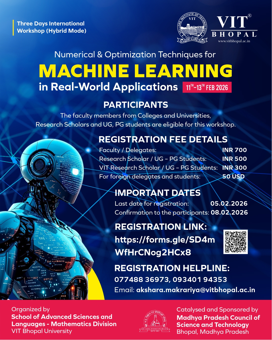 Bangalore: The Mathematics Division, School of Advanced Sciences and Languages (SASL), VIT Bhopal University successfully organized a three-day International Workshop titled “Numerical & Optimization Techniques for Machine Learning in Real-World Applications” from 11th to 13th February 2026, in online mode. Technical sponsorship for the workshop was extended by the Madhya Pradesh Council of Science and Technology (MPCST), Bhopal.
