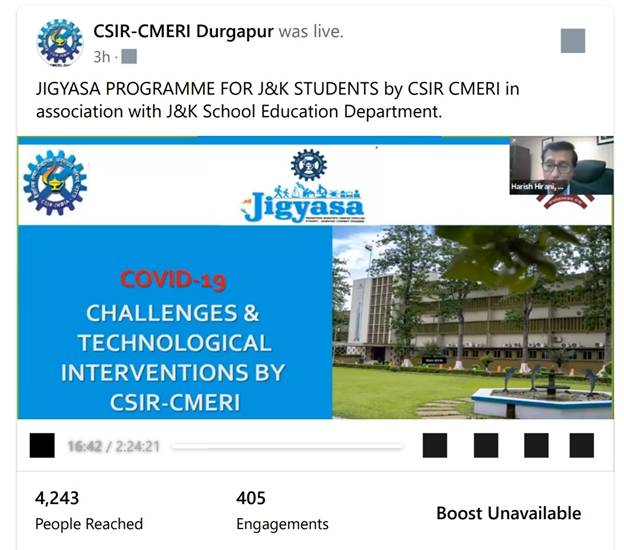 Prof. (Dr.) Harish Hirani was addressing a webinar,hosted by CSIR-CMERI Durgapur in association with Samagra Siksha, Department of School Education, Jammu & Kashmir on 08.09.2020 on Scientific & Technological Interventions by CSIR-CMERI combating COVID-19 as a part of the ‘Jigyasa’ programme. The event had the following keynote speakers: 1) Prof. (Dr.) Harish Hirani, Director, CSIR-CMERI, Durgapur 2) Dr. Asgar Samoon, IAS, Principal Secretary, School Education, Technical Education & Skill Development, Jammu & Kashmir, 3) Dr. Anjali Chatterjee, Chief Scientist, CSIR-CMERI, 4) Dr. Himadri Roy, Principal Scientist, CSIR-CMERI, 5) Mr. Avinash Yadav, Senior Scientist, CSIR-CMERI, 6) Dr. Nasir ul Rasheed, Senior Scientist, CSIR-CMERI and 7) Mr. Sanjay Hansdah, Scientist, CSIR-CMERI. The webinar was attended by more than 3,500 participants.