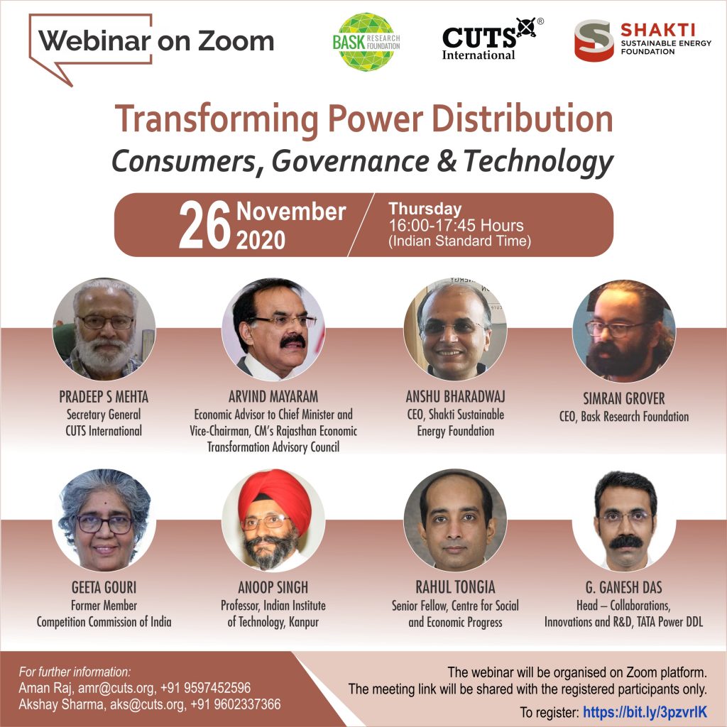 CUTS & BASK Research Foundation is organising a Webinar on “Transforming Power Distribution: Consumers, Governance & Technology”, November 26, 2020│16:00 – 17:45 Hours (IST) with eminent researchers, policy makers, technologists and government officials (Please see flyer in the trailing mail for details).