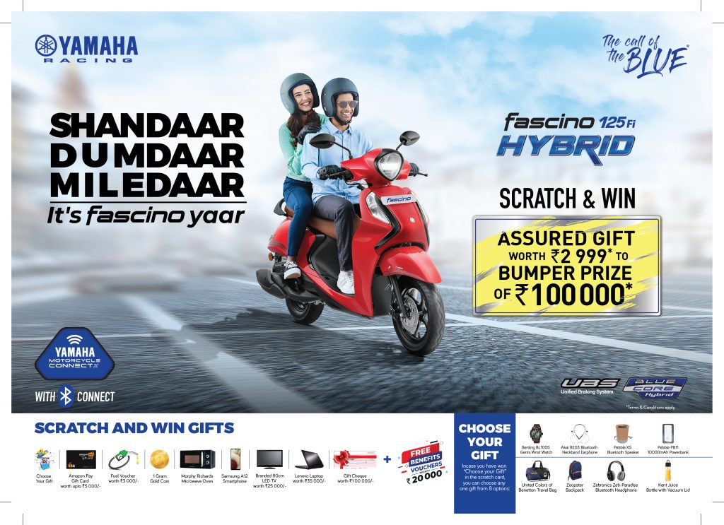 Mumbai: Yamaha Motor India group of companies, one of the leading two-wheeler companies in India, today announced special offers, in lieu of the upcoming festivities, which are valid till 31st August’21. The offers are currently valid on Yamaha’s scooter range available in India, which includes the newly launched Fascino 125 Fi Hybrid, followed by the Ray ZR 125 FI, Ray ZR Street Rally 125 FI and the non-Hybrid version of the Fascino 125 Fi. The customers who are planning to purchase a Yamaha scooter in August will get an assured gift worth Rs. 2,999. In addition to this, they also stand a chance to win a bumper prize as well as additional benefits of Rs. 20,000 and more.